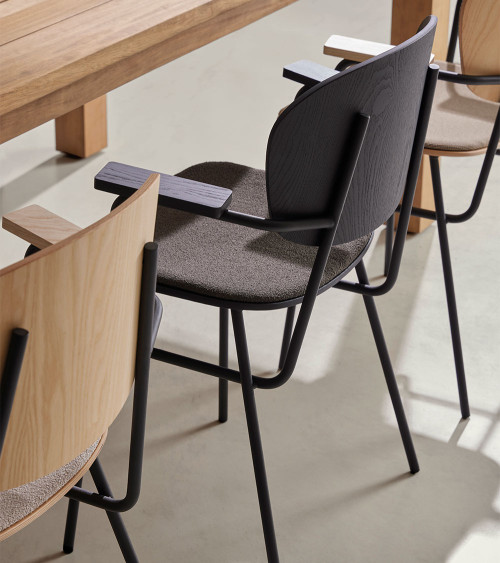 The Fosca Upholstered Armchair by Blasco and Vila is part of a fully rational collection characterized by its exposed structure and a sophisticated body resting on it, interpreted as the minimalist element of the ensemble. Made of solid ash wood —in natural or black finishes— it removes any superfluous detail to focus on proportion, ergonomics, and the essence of the material. Its curved backrest extends gently to offer enveloping support, promoting a comfortable and natural posture. The collection, in constant evolution, includes chairs, armchairs, sofas, and stools with or without side tables, all connected through a language of soft lines, broad shapes, and aesthetic coherence that reinforces its identity.