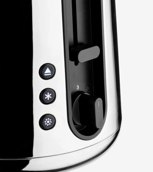 The Toru Toaster by Alessi is an electric toaster designed by the Japanese studio Nendo. Presented in 2020, it stands out for its minimalist and functional design. Inspired by a "block" of bread, it has a compact, rectangular structure with clean lines and no unnecessary embellishments. Its main innovation is the sliding base that allows the bread to be placed without the need for a lever, improving user comfort. Made from 18/10 stainless steel and thermoplastic resin, its timeless design and high-quality finish adapt to any modern kitchen. Additionally, it offers precise toasting control, adjustable to preferences. The Toru is a combination of aesthetics and functionality that elevates the everyday experience of toasting bread.