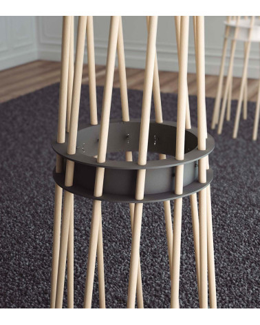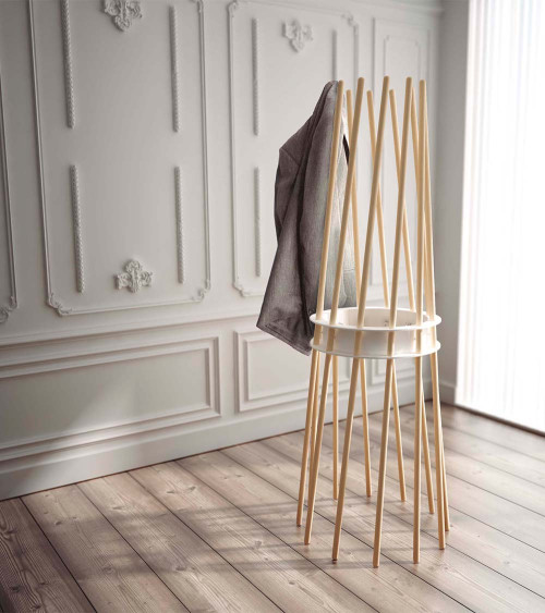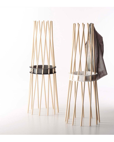 La estructura está fabricada en en plancha de acero con acabado lacado al horno y barras en madera de haya, lo que aporta durabilidad y resistencia al uso cotidiano. Su sistema de fijación asegura una instalación firme y estable, ofreciendo una superficie segura para almacenar prendas y accesorios de uso diario.