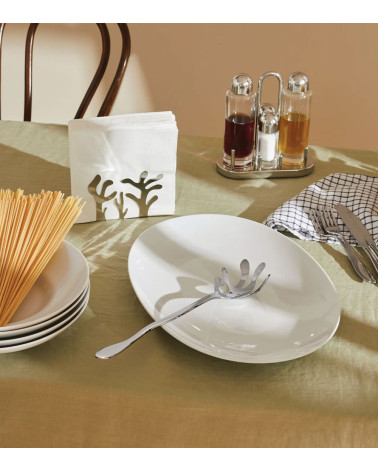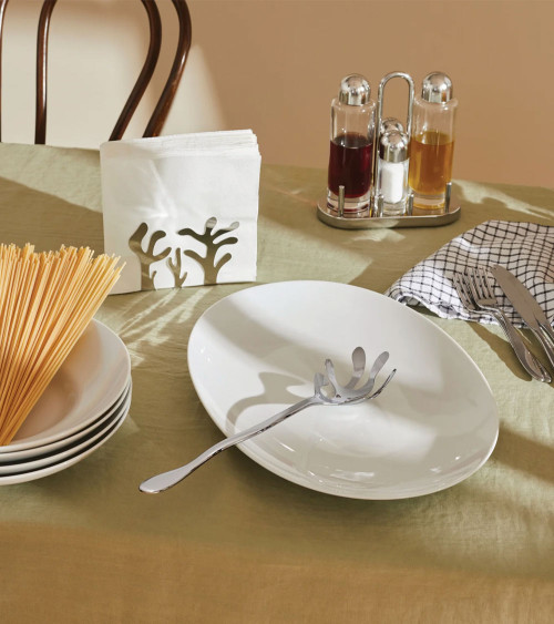 El servilletero Mediterráneo de la marca Alessi, fusiona la funcionalidad con una elegancia evocadora en un diseño distintivo y moderno. Inspirado en la fluidez de las olas del mar Mediterráneo, este servilletero ofrece una interpretación contemporánea del diseño funcional. Su estructura en acero inoxidable pulido se destaca por sus líneas suaves y formas orgánicas, que no solo mantienen las servilletas ordenadas, sino que también aportan un toque de sofisticación a cualquier mesa. Ideal para quienes buscan un complemento de diseño que combine estética y practicidad.