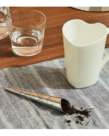 El Filtro de té You de Alessi, diseñado por Miriam Mirri, combina funcionalidad y diseño con su forma cónica y alargada que facilita el llenado y vaciado del contenido. Su versatilidad lo hace adecuado para cualquier taza, mientras que su corazón como símbolo lo integra en la colección de objetos de Alessi con un toque de ternura y elegancia.