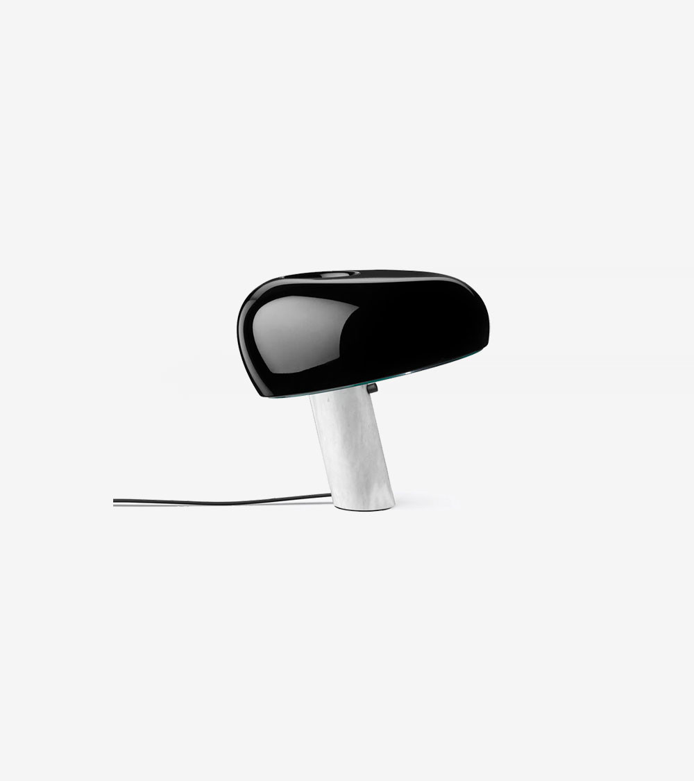 Diseñada en 1967, la Luminaria Snoopy de Flos une mármol y metal esmaltado en una forma icónica. Funcional y decorativa, es un clásico del diseño moderno.