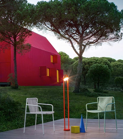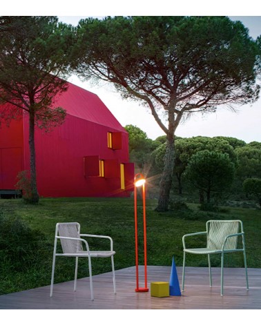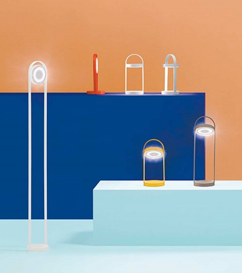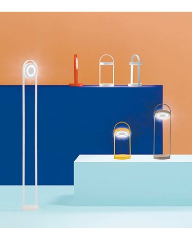 Giravolta es una lámpara sin cables con un diseño contemporáneo, apta para el exterior. Dos discos de material plástico, la base y el difusor de LED que gira 360º grados y que direcciona la luz, se combinan con un arco de extruido de aluminio. Un lastre de hierro fundido garantiza la estabilidad de la lámpara al suelo. La estructura está disponible en varios colores: Blanco, negro, cromado, naranja, mostaza y verde. Disponible en 3 tamaños.