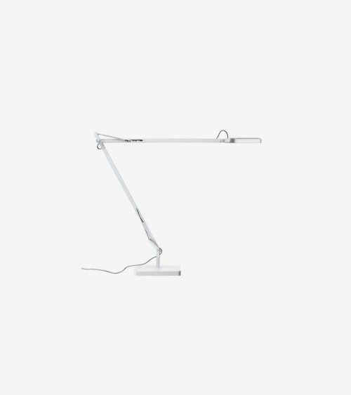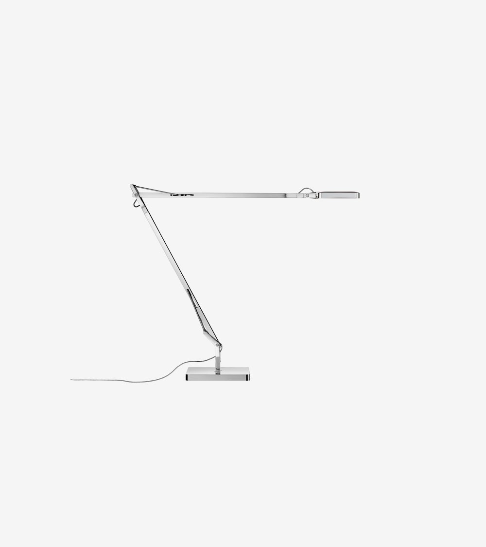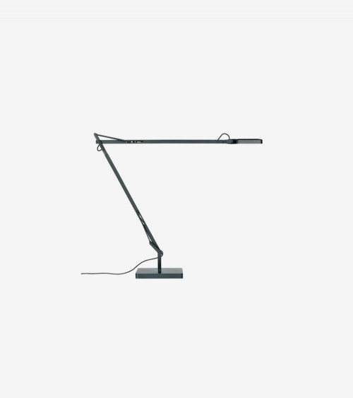 Lámpara de sobremesa para iluminación directa, con doble brazo y cabeza orientable. Cuerpo realizado en aleación de aluminio fundido. Parte exterior de la cabeza realizada en inyección de aluminio con difusor en metacrilato estampado. Los tirantes exteriores son en cable de acero de 3 mm de diámetro. Disponible en acabados blanco, antracita, negro o cromado. El interruptor ON/OFF es electrónico y está equipado de un mecanismo óptico situado en la cabeza. Dos opciones posible: - CONFIGURACIÓN PERSONAL (interruptor naranja que regula la intensidad de la luz como prefieras) - GREEN MODE (interruptor verde, ahorrando cada vez más energía gracias a su posibilidad de compensación automática de la luz ambiental)