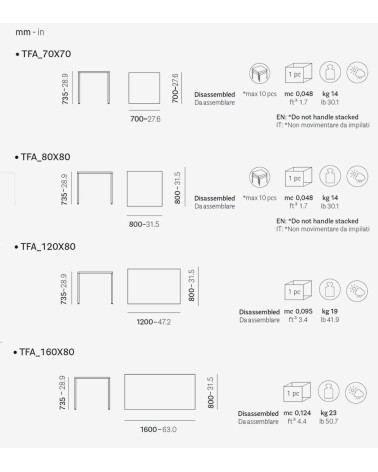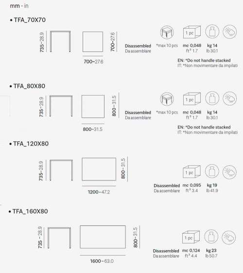 - Medidas (ancho x fondo x altura): TFA_70x70 - 700 x 700 x 735 mm / TFA_80x80 - 800 x 800 x735 mm / TFA_100x100 - 1000 x 1000 x735 mm / TFA_120x80 - 1200 x 800 x 735 mm / TFA_160x80 - 1600 x 800 x 735 mm.